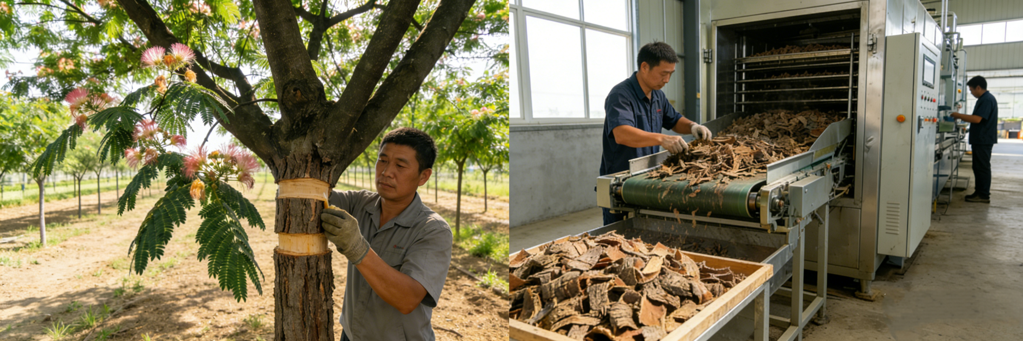 The producing regions often employ a tending model that "combines landscaping with medicinal material production," planning and planting the silktree as a street tree, garden tree, or ecological forest species. Key management techniques include: selecting robust plants aged over 10 years as the target for bark harvesting; employing "rotational harvesting by stages," meaning only a portion of the bark is harvested each time in a ring-like pattern, and the wound is treated with a protective agent to allow healing and regeneration, thereby achieving sustainable utilization; collecting bark from pruned branches during regular landscaping pruning; and implementing scientific "integrated water and fertilizer management," applying appropriate amounts of organic fertilizer before sprouting in spring and during the vigorous growth period in summer to promote tree recovery and the synthesis of active components.