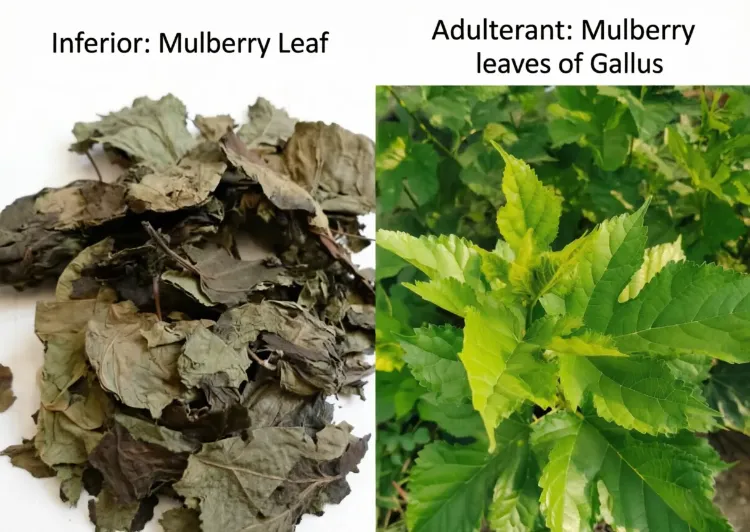 Ordinary / Inferior Mulberry Leaf: The leaves are small and thin, with a dull or excessively dark color (brownish-black), severely broken, or mixed with a large number of leaf stalks, twigs, and other impurities. The color is dark and lusterless, or unnaturally bright green (suspected dyeing). The texture is damp and sticky to the touch, or dry and brittle, easily crumbling into powder. The aroma is weak or faint, possibly with musty, sour (sulfur fumigation), or smoky odors. Rubbing produces no aroma. When soaked, the infused liquid is turbid or develops an abnormal color (too dark), with an unpleasant odor. When tasted, it is bland or excessively bitter and astringent.