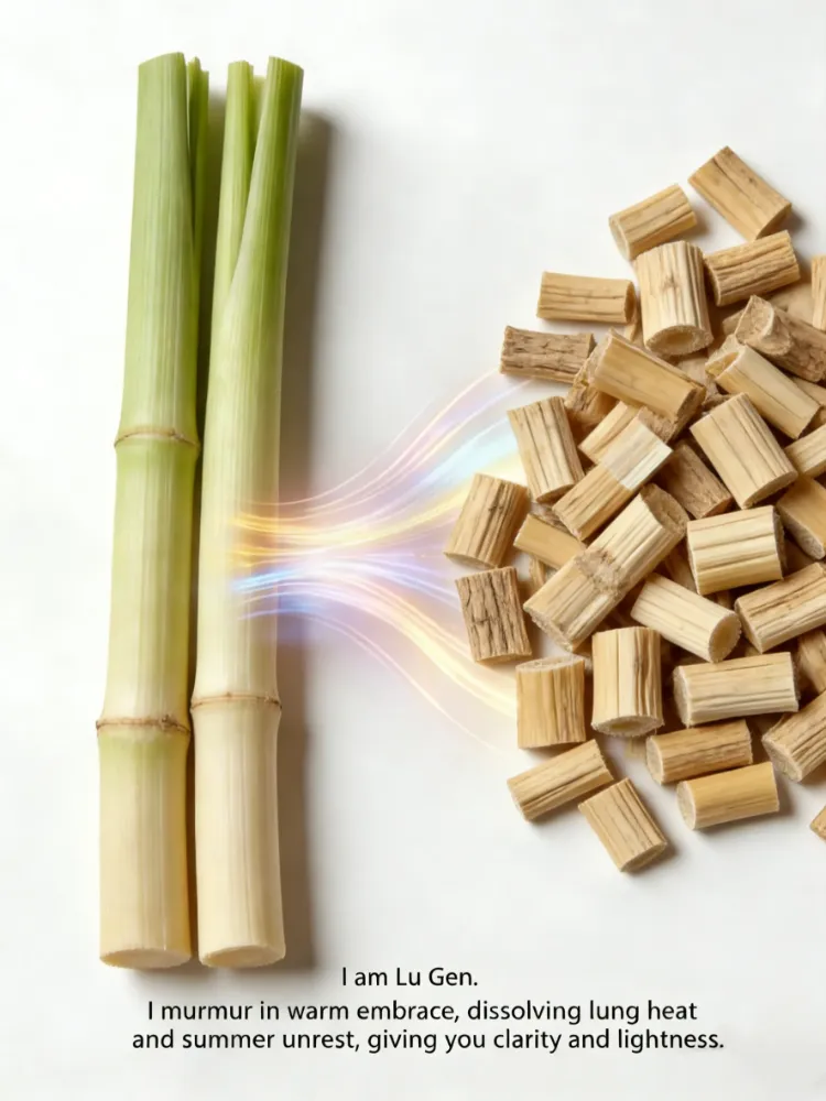 Reed Rhizome, cold and sweet, clears heat, generates fluids, relieves irritability, and promotes urination. Made into herbal bath soak, it eases lung heat, summer irritation, hot stranguria, and lung-heat cough; summer bathing refreshes.