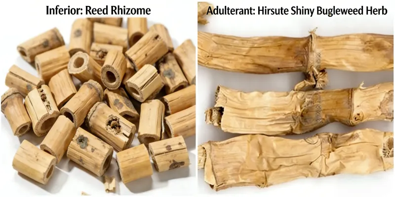 Ordinary / Inferior Reed Rhizome:The rhizome is slender and thin, with irregular lengths. The surface is dull and gray (greyish-brown or yellowish-brown), with excessively short or long internodes and poor luster.Residual fibrous roots, buds or soil are commonly present. The texture is dry and brittle, or damp and moldy.The cut surface is dark in color, hollow with uneven wall thickness, and the small pores are irregularly arranged.The odor is weak, or has moldy smell, sour smell (sulfur fumigated). The taste is bland, bitter or astringent.After soaking, the liquid is turbid and the Reed Rhizome segments tend to disintegrate. After decoction, the decoction shows abnormal color or offensive odor.