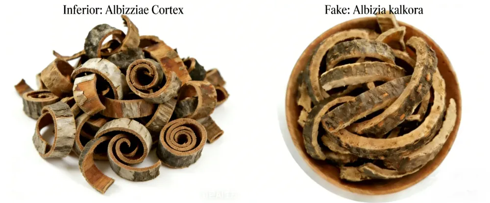 High-quality Silktree albizia bark: appears in rolled cylindrical or semi-cylindrical pieces, varying in length and of uniform thickness (typically 2-7 mm). The outer surface is grayish-brown to grayish-brown, marked with slight longitudinal wrinkles and densely covered with prominent brown or reddish-brown elliptical, transverse lenticels. The inner surface is light yellowish-white, smooth, with fine longitudinal striations. The texture is hard and brittle, breaking easily. The fracture surface is fibrous and flaky, displaying a light yellowish-brown or yellowish-white color. It has a slight fragrance and a mild, slightly astringent taste with a mild irritating sensation on the tongue.