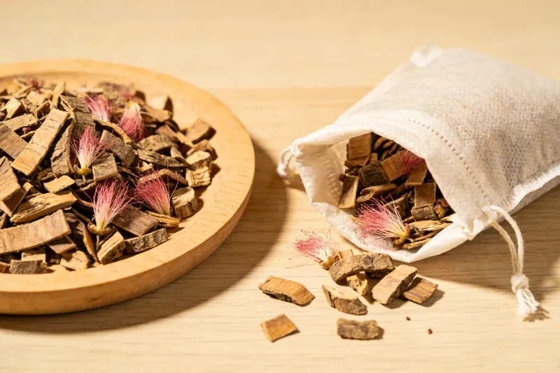 Silktree albizia bark is neutral in nature and sweet in taste. Its meridian tropism are the heart, liver, and lung meridians. Its core efficacies are "resolving depression and calming the mind, and invigorating blood and reducing swelling." Its mind-calming power focuses on achieving its effect by resolving liver depression and gladdening the heart and mind. Its nature is mild and free from the drawback of being harsh or drying. Through external application in the form of a "bath soak bag," its medicinal properties can leverage the warmth and circulating power of the water to penetrate the skin, exerting a unique effect of "co-regulating the body and mind."