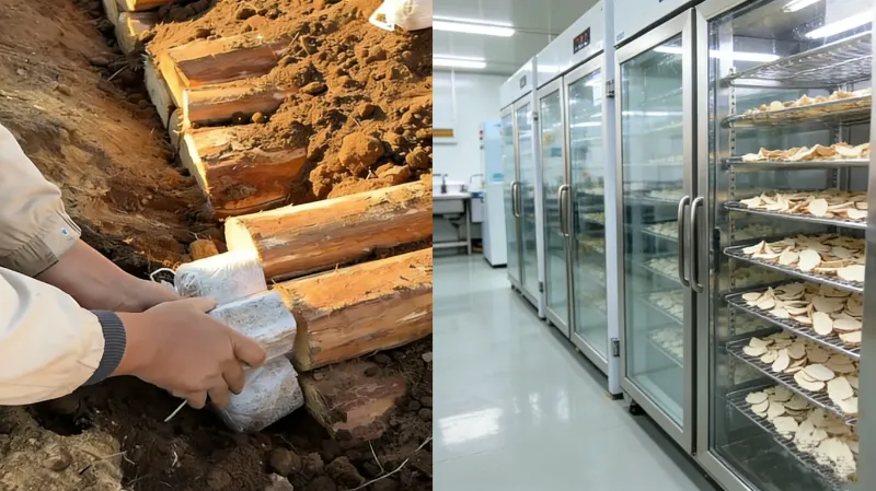 2.Improved Variety Breeding and Inoculation Science: Specialized breeding bases for Poria cocos strains have been established in the production areas, cultivating high-yield and high-quality strains such as "Poria No. 5" and "Poria No. 8." Inoculation employs a combination of "flesh lure" and "spawn lure" techniques — high-quality fresh Indian Bread slices ("flesh lure") or pure cultured strains ("spawn lure") are inoculated at both ends of the log segments, with temperature and humidity controlled to promote mycelial colonization. This technique has increased the inoculation success rate from the traditional 60% to over 95%.
