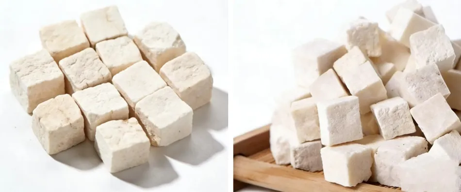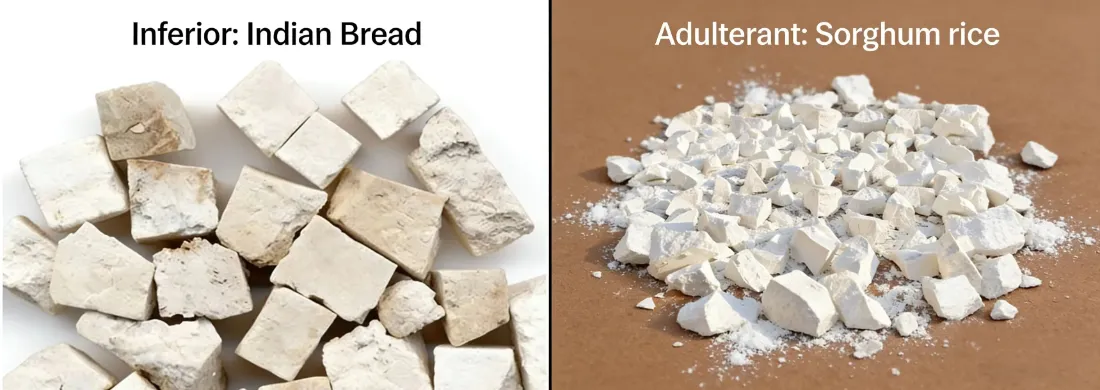 Ordinary/Inferior Indian Bread: The outer skin has a dull color, with shallow or absent wrinkles. Cut products are grayish-white or dark in color, with uneven edges and often appear fragmented. The texture is light and porous or loose and brittle, easily broken. The cross-section is rough, with poor powdery quality, and lacks stickiness when chewed or feels gritty (possibly indicating mineral adulteration). The taste is bland or may have a sour taste (sulfur fumigation), astringent taste (adulteration), or musty odor. It lacks stickiness or has poor stickiness when chewed. When soaked in hot water, the liquid becomes turbid or the cubes quickly disintegrate. When baked with fire, it emits a burnt or sour odor. It turns blue when tested with iodine (indicating adulteration with cassava starch, etc.).