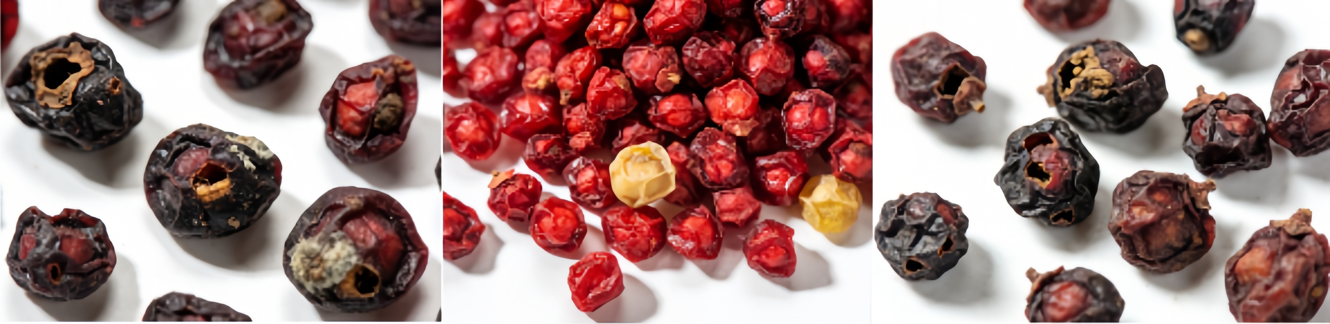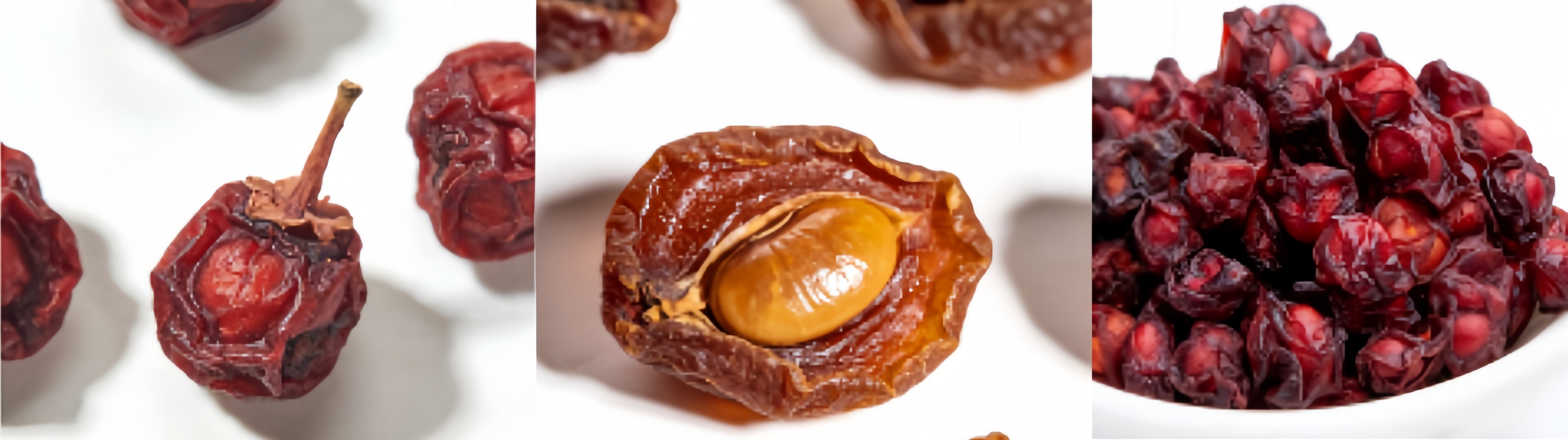 The fruits appear shriveled, small, and underdeveloped, often with unnaturally bright and uniform colors—such as vivid red, bright red, or pale yellow (over-sulfur fumigation may cause discoloration). The flesh is thin and hard. The peel easily separates from the seeds, or the batch is mixed with a significant amount of stems, leaves, or other impurities. The aroma is faint, or carries musty or rancid notes. The taste is monotonous, predominantly sour and astringent, or nearly flavorless. When soaked, the solution quickly turns dark red or becomes cloudy, and the fruits tend to break apart or disintegrate easily. The texture is either brittle and hard or unpleasantly damp and sticky to the touch.
