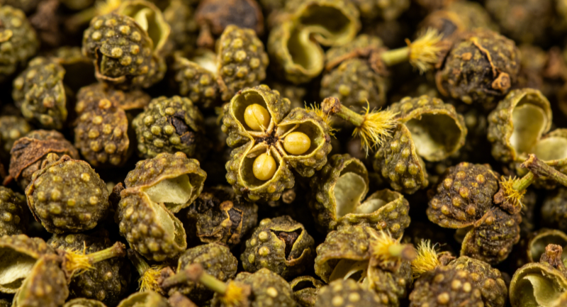 The fruit is pentagonal and oblate-spheroidal, with a diameter of 2–5 mm. The surface is dull yellowish-green to brown, coarse, and marked with numerous dotted protrusions (oil cells) and fine wrinkles. The texture is firm and not easily broken, with clearly distinguishable carpels. It possesses an intense and distinctive aroma, characterized by a strong pungent-spicy, bitter fragrance with a musky undertone. When tasted, it is pungent and intensely bitter, leaving a persistent burning and numbing sensation on the tongue. Soaking in warm water for a short while causes the liquid to gradually turn pale yellowish-green, and its characteristic pungent and intense odor becomes more pronounced. The fruit expands but does not disintegrate.