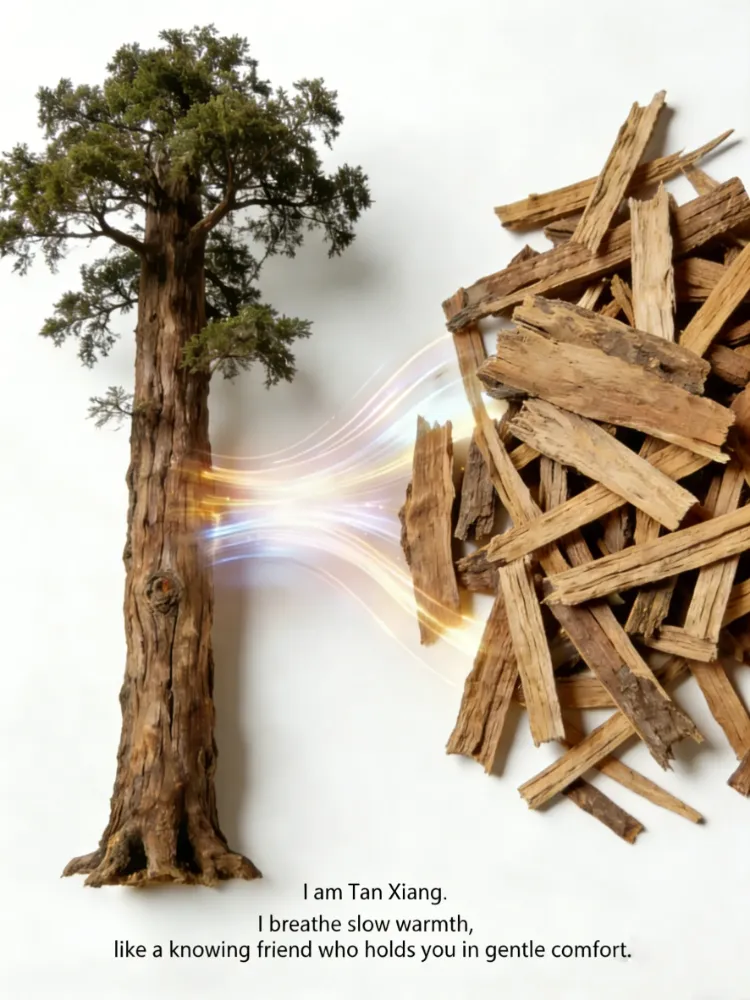 Santali Albi Lignum, a wisp of warm fragrance from the ancient sacred wood, carrying sweet creamy and woody notes, gently entering your spleen, stomach, heart, and lung meridians, using qi-moving warmth to ease cold pains in chest and belly.