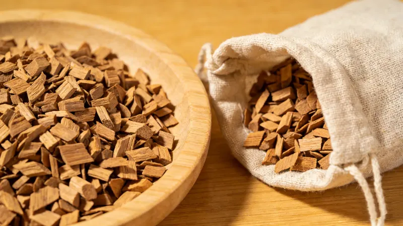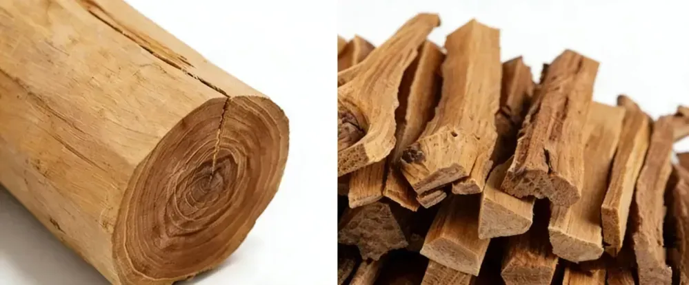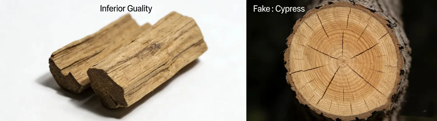 Ordinary/Inferior Sandalwood: The color is pale, dull, or lacks luster, often consisting of sapwood or immature wood. The texture is relatively light, and it may float or partially float in water. The grain is coarse or indistinct. The aroma is faint, short-lived, or accompanied by sharp, sour, musty, or chemical-like odors. When burned, the smoke is turbid and the smell is pungent. The taste is bland or absent. The texture feels dry, rough, or coarse to the touch.